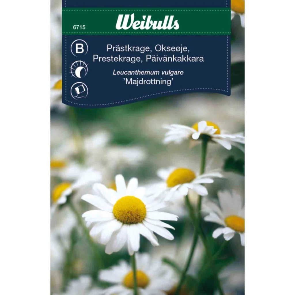 Okseøje, 'Maj Dronning' er storblomsterne. Den traditionelle midsommerblomst. Fremragende snitblomst. Sammen med for eksempel kornblomster bliver det en dejlig sommerbuket. Dyrkning: Direkte såning på plantestedet kan foretages i løbet af maj-september. Så lavt og hold frøet fugtigt. Forkultivering kan foregå indendørs i det tidlige forår. Plant ud på plantestedet i forsommeren efter blødgøring.